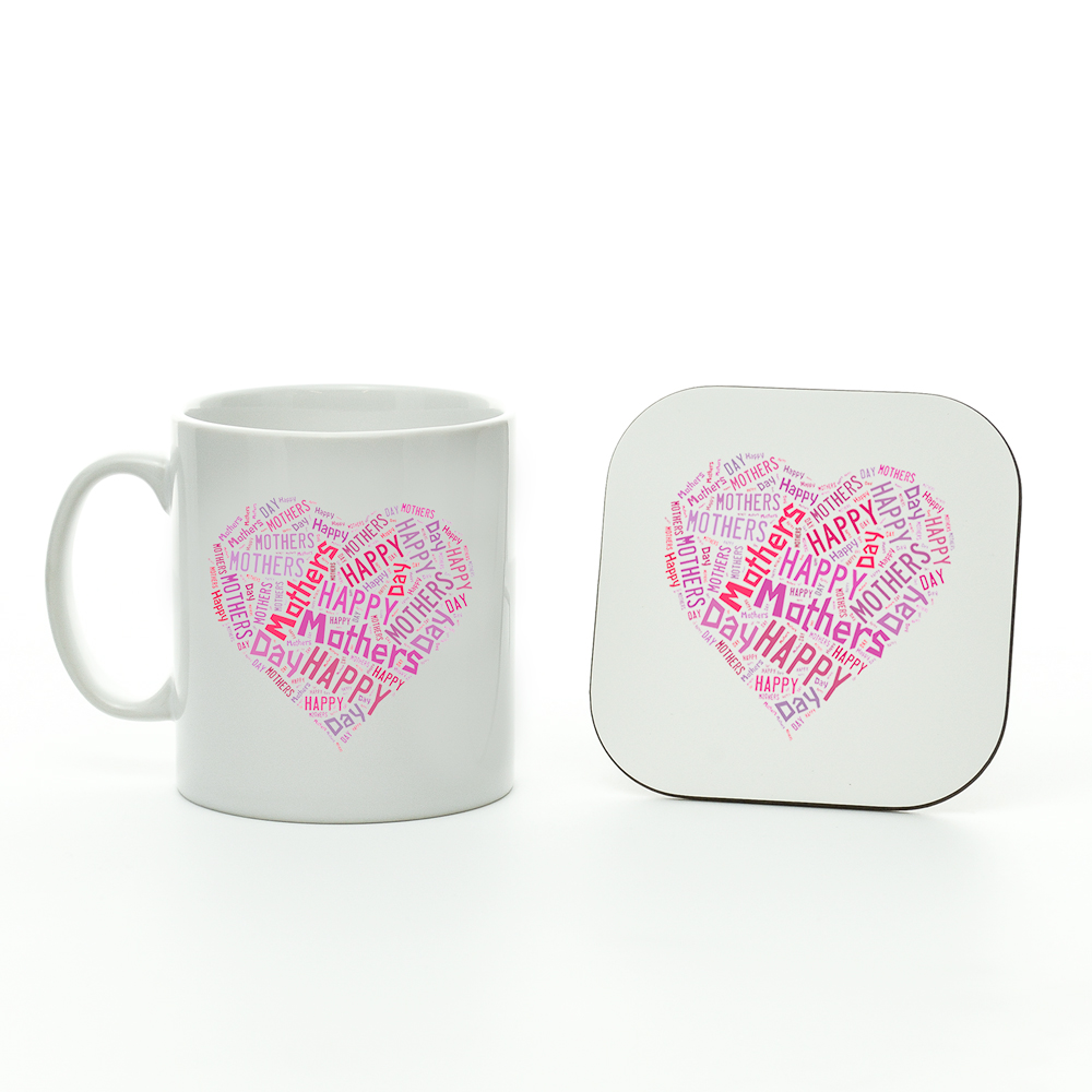 Mug and Coaster have a heart design containing a Mother’s Day design
