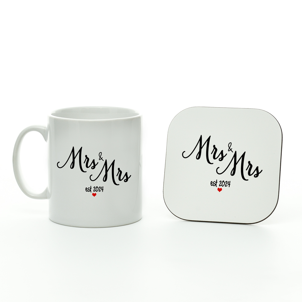 Mrs & Mrs Est 2024 Mug and Coaster Set, LGBQT Wedding Gift, New Wife Present, Mrs & Mrs Mug and Coaster, Gay Wedding Present, Wedding Mug and Coaster Set